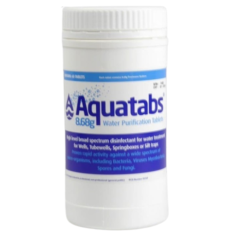 Aquatabs Multipurpose Tablets are available in 8,68g tablet strength. The tablets are presented in a plastic tub with a lid with a shelf life of 3 years.