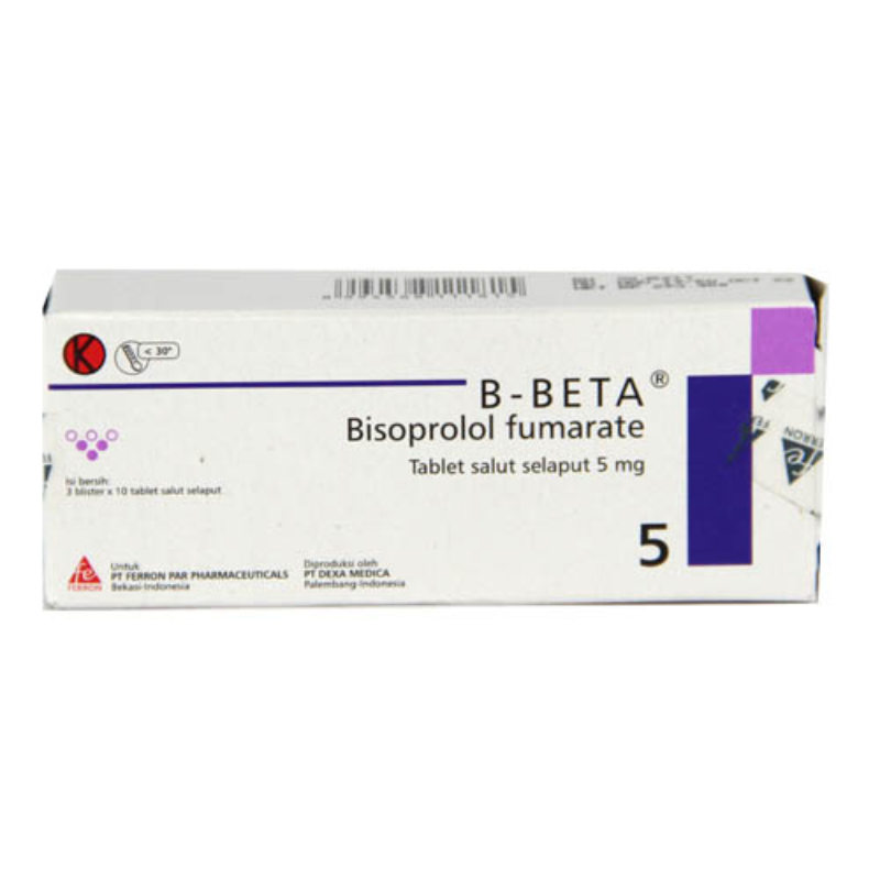 B-BETA 5 MG TABLET mengandung zat aktif Bisoprolol yang merupakan obat anti hipertensi golongan Beta-Blocker Kardioselektif. Bisoprolol merupakan golongan obat beta-blocker yang bekerja dengan cara menghambat kerja sistem saraf simpatis pada jantung dengan menghambat reseptor beta-adrenergik jantung. Obat penghambat beta-adrenergik seperti Bisoprolol menurunkan kecepatan denyut jantung dan bermanfaat dalam terapi irama jantung yang cepat secara tidak normal. Bisoprolol juga menurunkan kekuatan kontraksi dari jantung dan menurunkan tekanan darah. Dengan menurunkan kecepatan denyut jantung dan kekuatan kontraksi otot, obat penghambat beta-adrenergik akan menurunkan kebutuhan jantung terhadap oksigen. Dengan demikian, maka obat ini digunakan untuk mengobati hipertensi sebagai monoterapi atau dikombinasikan dengan antihipertensi lain dan pengobatan angina serta gagal jantung kronik. Dalam menggunakan obat ini HARUS SESUAI DENGAN PETUNJUK DOKTER.