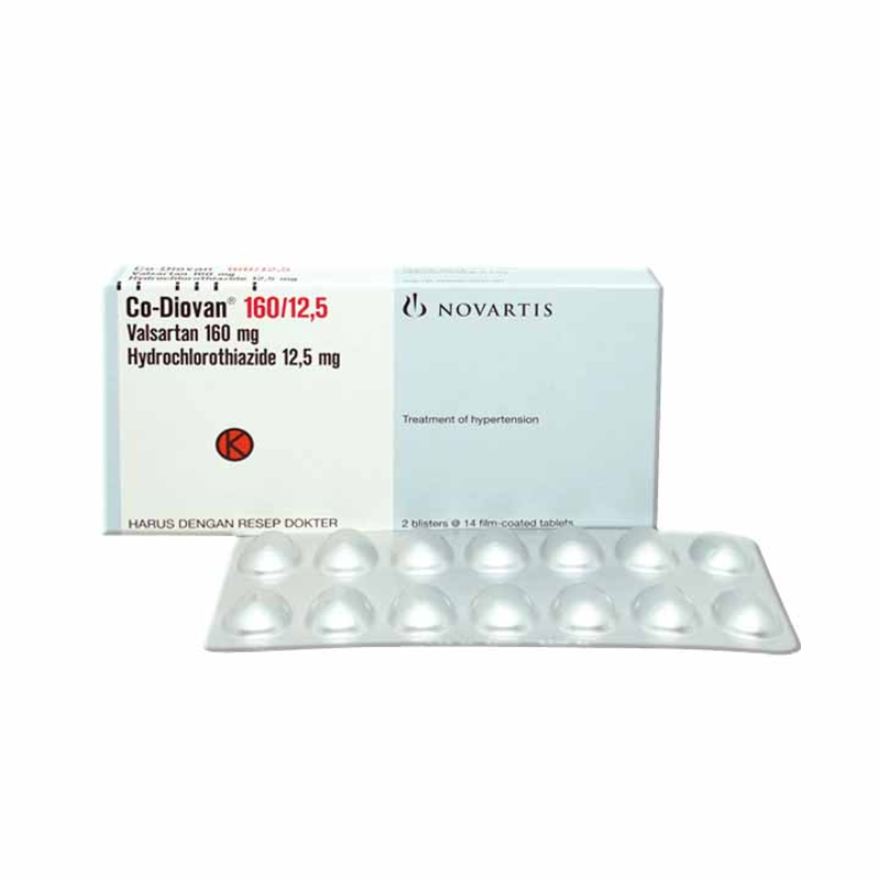 Co-Diovan 160 mg / 12.5 mg adalah obat yang mengandung kombinasi bahan aktif Valsartan 160 mg dan Hydrochlorothiazide 12.5 mg. Obat ini digunakan untuk menurunkan tekanan darah tinggi pada penderita hipertensi dan gagal jantung kongestif. Kandungan valsartan ini bekerja dengan merelaksasi pembuluh darah, sedangkan hydrochlorothiazide bekerja dengan meningkatkan produksi urin dan melebarkan pembuluh darah. Dalam penggunaan obat ini harus SESUAI DENGAN PETUNJUK DOKTER.