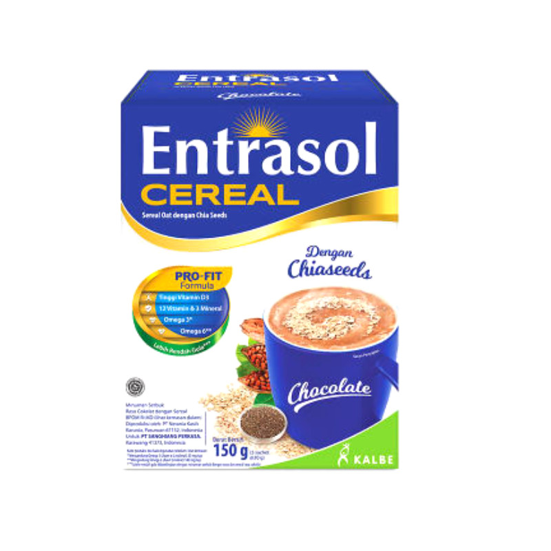 Entrasol Cereal Chocolate merupakan minuman serelia dengan Pro-Fit Formula (Tinggi Vitamin D, 12 Vitamin & 3 Mineral, Omega 3 & 6), Oat Pilihan & Chia Seed untuk menjaga kesehatan tulang dan saluran cerna, mengenyangkan, serta rendah gula yang dapat mendukung pola hidup sehat setiap hari.