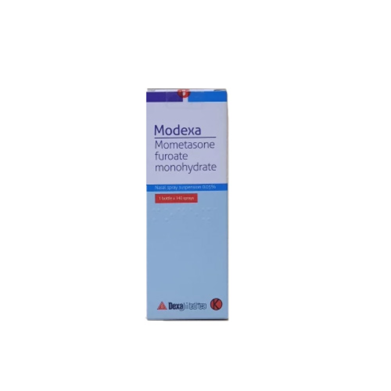MODEXA NASAL SPRAY mengandung zat aktif Mometasone Furorate. Mometasone Furorate termasuk golongan kortikosteroid. Obat ini digunakan untuk pengobatan rhinitis alergi seasonal dan menahun terutama pada alergi sedang sampai berat yang menetap, dan polip nasal. Mometasone menekan pembentukan, pelepasan, dan aktivitas dari mediator inflamasi (kinin, histamine, enzim liposomal, dan prostadglandin). Dalam penggunaan obat ini harus SESUAI DENGAN PETUNJUK DOKTER.