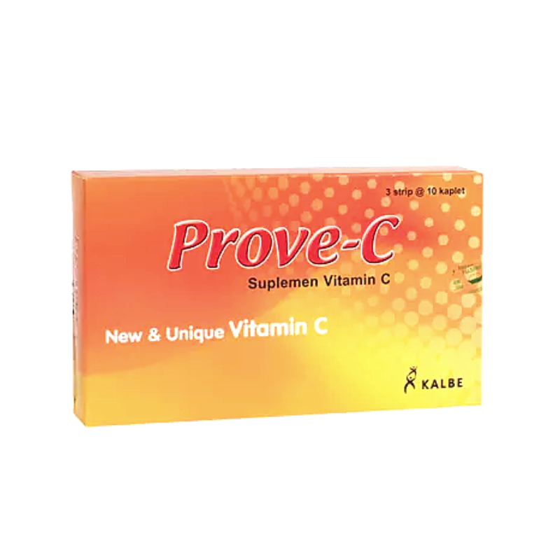 PROVE C TAB 30S mengandung Pureway-C adalah suatu bentuk vitamin C yang merupakan kombinasi antara ascorbic acid dengan suatu metabolit lemak sehingga dapat diserap dengan lebih baik dan lebih cepat ke dalam tubuh. PROVE-C digunakan sebagai suplemen vitamin C yang diperlukan pada kondisi peningkatan kebutuhan akan vitamin C, seperti pada saat masa penyembuhan dari sakit atau penyembuhan luka, pada saat terkena common cold, atau pada saat kondisi daya tahan tubuh turun.