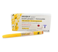 SOLIQUA 100/50 PEN merupakan sediaan yang mengandung kombinasi Insulin Glargine 100 IU dan Lixisinatide 50 mcg . Insulin ini digunakan untuk pengobatan diabetes melitus pada orang dewasa dan dapat diberikan bersama dengan obat antidiabetik oral lainnya pada pasien Diabetes Melitus Tipe 2. Dalam penggunaan obat ini harus SESUAI DENGAN PETUNJUK DOKTER.