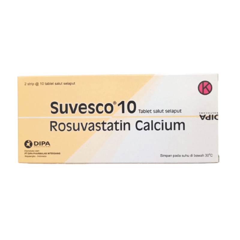 SUVESCO 10MG TAB 20S mengandung zat aktif Rosuvastatin Calsium. Tersedia dalam bentuk tablet yang didistribusikan oleh PT. Dipa Pharmalab Intersains. Produk ini dapat digunakan untuk pasien dengan hiperkolesterolemia primer (tipe IIa) atau bersama dengan dislipidemia (tipe IIb) sebagai tambahan diet bilamana respon terhadap diet & gerak badan tidak cukup. Rosuvastatin mengurangi kolesterol LDL tinggi , kolesterol total, trigliserida & ApoB, & meningkatkan kolesterol HDL.
